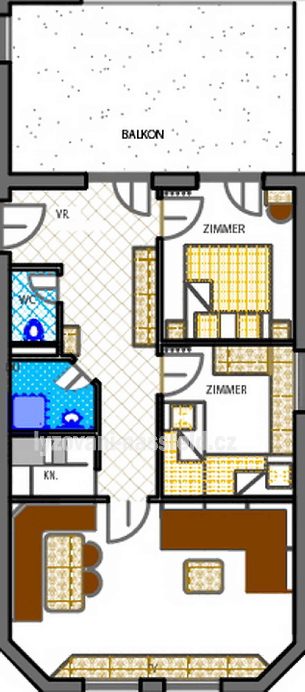 Tento apartmán má velkou předsíň, jednu ložnici s manželskou postelí, jednu s patrovými postelemi, velký obývací pokoj s jídelním koutem a sedací soupravou, která se dá rozložit. Mala kuchyň ma sporák s troubou.Koupelna se sprchovym koutem. Samostatná toaleta. Velký balkón. Moznost parkování v garáži.