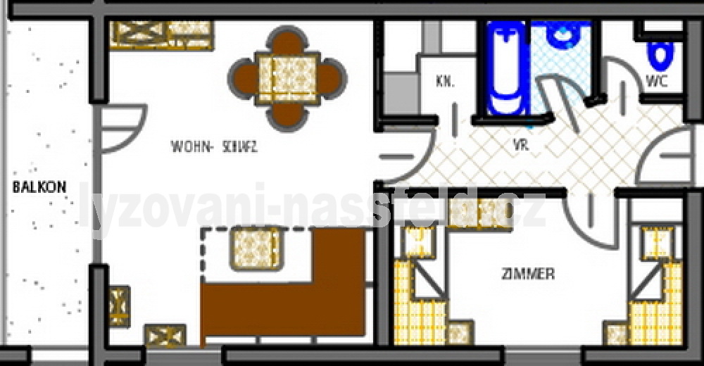 Velká předsíň, obývací pokoj s jídelním koutem a gaučem, který se dá rozložit, balkón, samostatná mala kuchyne. Ložnice. Koupelna s vanou, samostatná toaleta.