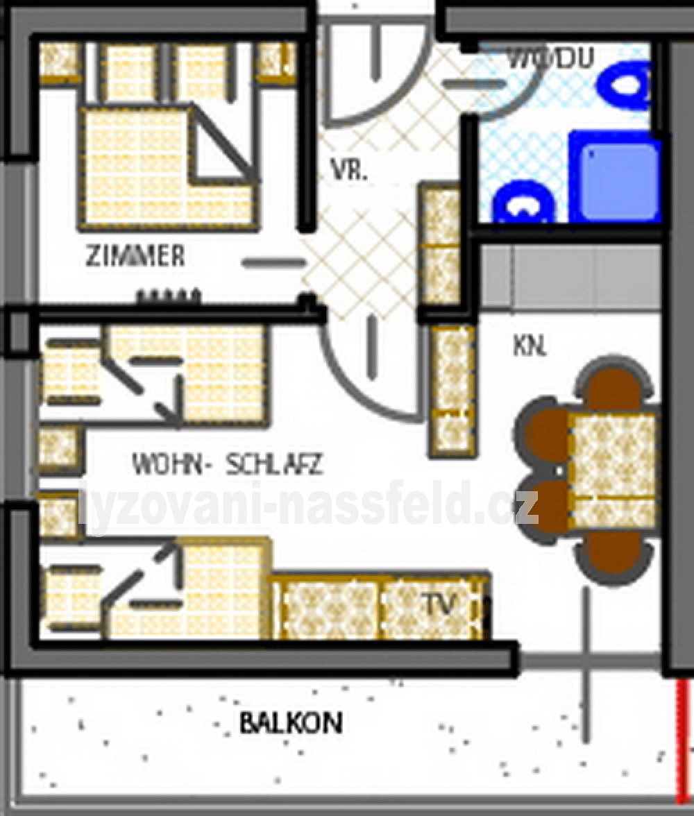 Apartmán Hildegard: Typ B, 28m2, Základní počet os. 2, max 4.Tento malý ale účelně zařízený apartmán ma předsíň, obytnou místnost s kuchyňským koutem, velkou sedací soupravou, která se dá rozložit, balkón, ložnice. Koupelna se sprchovým koutem,toaletou.