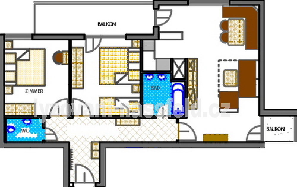 Tento apartmán ma velkou předsíň, obývací pokoj, kuchyňský kout, který je vybaven myčkou na nádobí, sporákem, mikrovlnou troubou, dva balkóny. Jedna ložnice má manželskou postel, druhá ložnice manželskou postel a patrovou postel. Velká koupelna s vanou. Toaleta separátně.