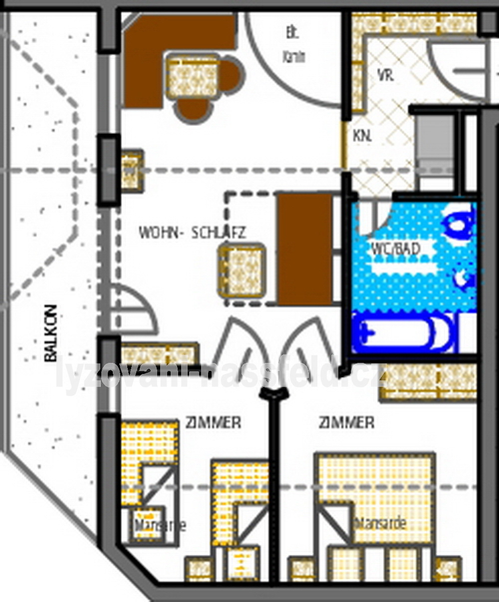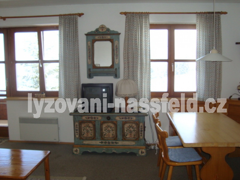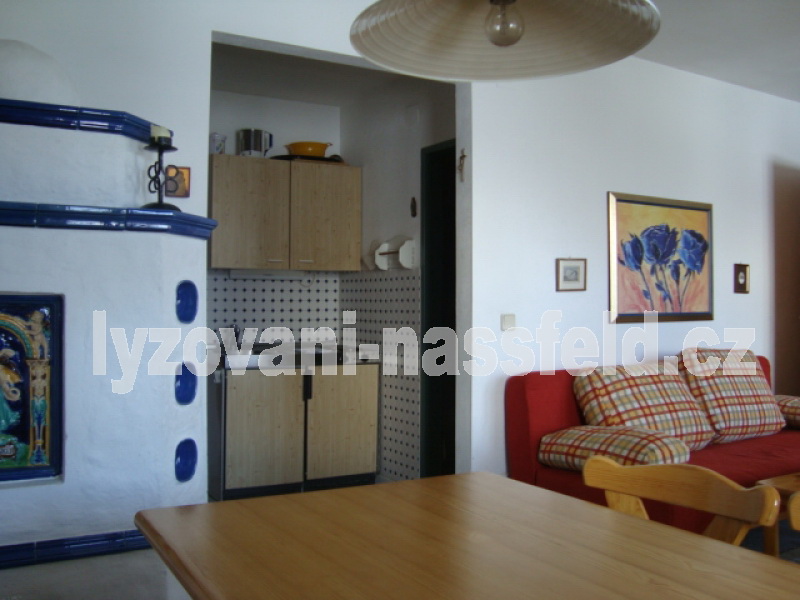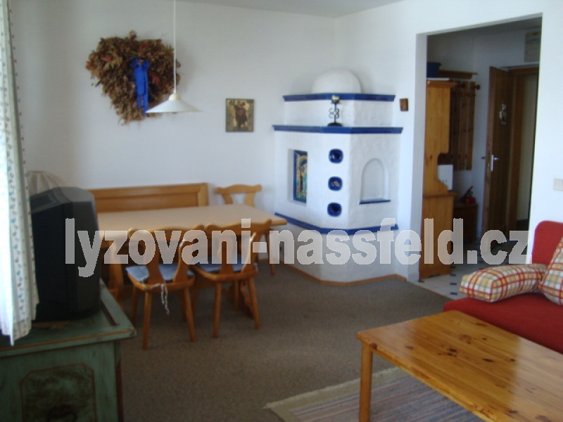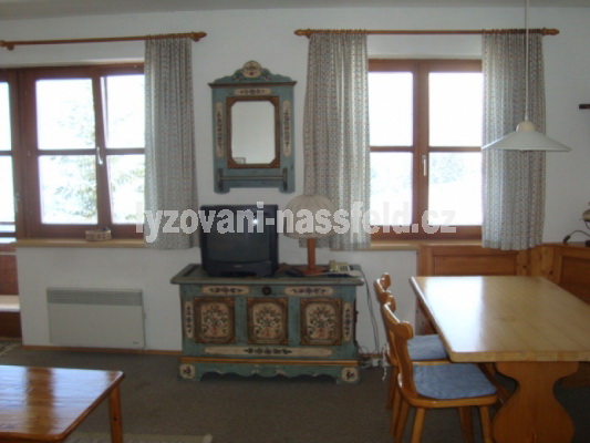Velký obývací pokoj s kachlovými kamny (el.), sedací souprava se dá rozložit, balkón, dvě samostatné ložnice. Koupelna s vanou, toaletou.