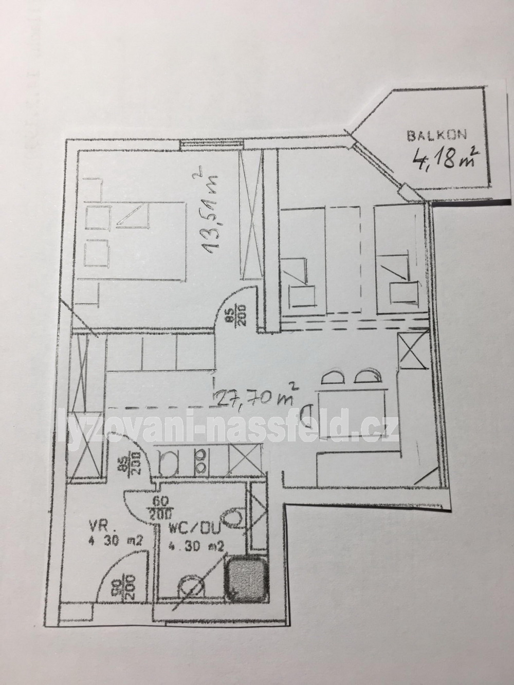 Předsíň, koupelna se sprchou a wc, samostatná ložnice kde je manželská postel. Velka obyvaci mistnost s rohovou lavici, kde je i rozkladaci gauč. Kuchyň má mikrovlnku. Za drevenou stenou, ktera se da zatahnout, jsou dve postele...dole se da vytahnout jeste treti. vychod na jizni balkón.