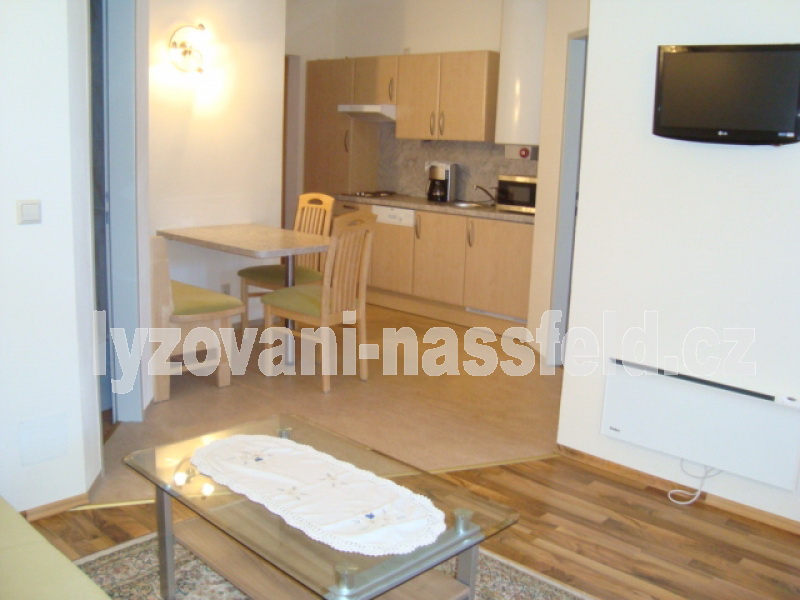 Kuchyň je vybavena myčkou na nádobí, mikrovlnou troubou. Kopelna ma sprchový kout, toaletu. Samostatná ložnice, obývací místnost má kromě manželské postele ještě gauč, který je možné rozložit.